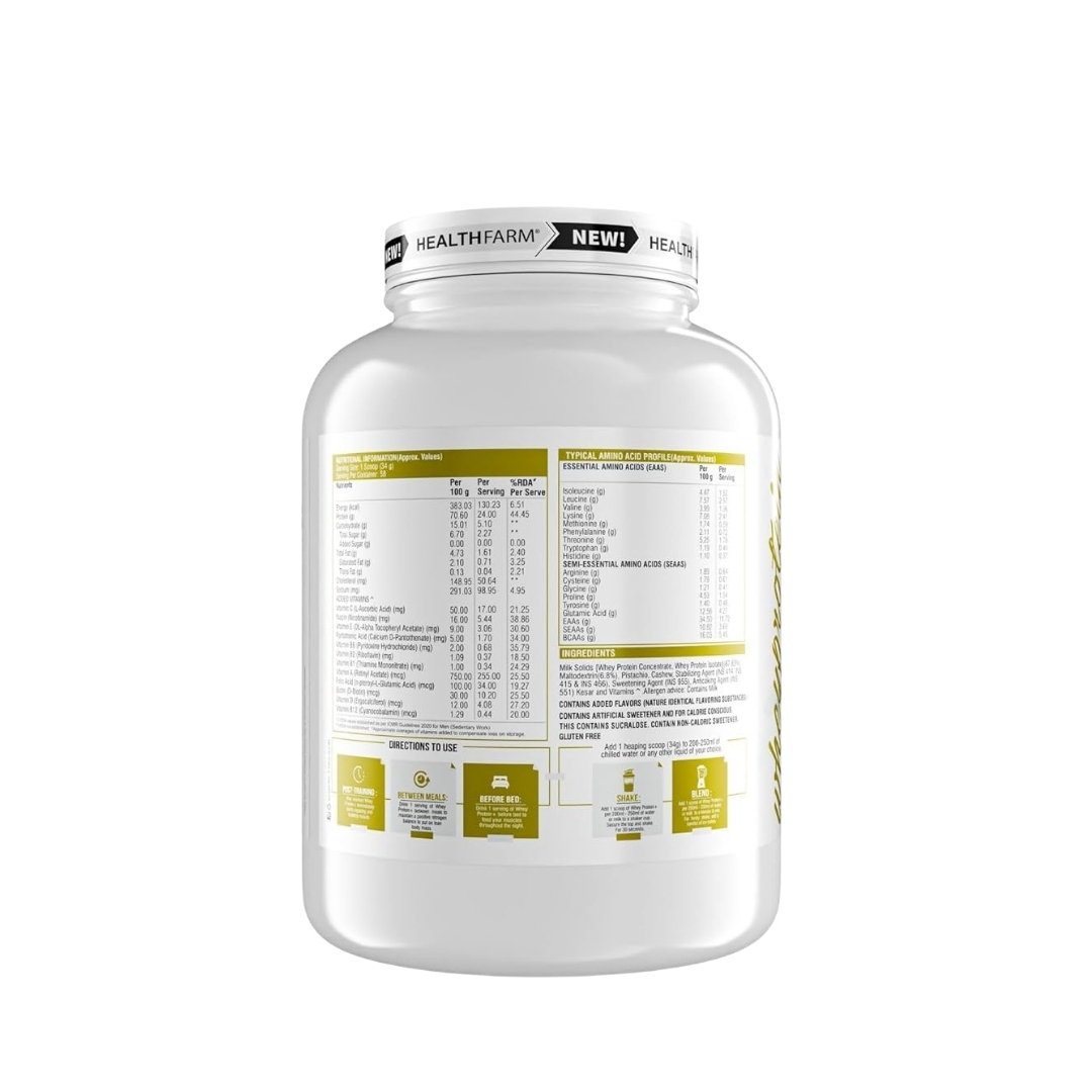 Healthfarm 100% Whey Protein is a high-quality protein supplement designed to meet the nutritional needs of athletes, gym enthusiasts, and active individuals. It delivers a rich source of complete protein that supports muscle repair, lean muscle development, and overall physical performance. Each serving provides an optimal balance of essential amino acids, including BCAAs and EAAs, which play a vital role in muscle recovery and reduced workout fatigue.